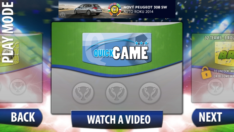 V případě Androidu je hlavní menu hry poněkud nepřehledné a první, co vám obrazovka nabídne, je přehrání několika videí, což vás zbaví po určitou dobu reklamy. Na velkém displeji nám reklama nevadila, takže jsme videa vynechali (přeci jen, k fotbalu reklama patří). Za asi 50 korun lze dokoupit verzi Pro, která je bez reklam a hned vám odemkne některé turnaje.