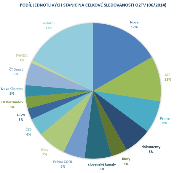 Květnové mistrovství světa v ledním hokeji vystřídal v červnu dlouho očekávaný fotbalový šampionát. Ani Diváci O2TV si nenechali živé přenosy z Brazílie utéct. Díky tomu si sportovní kanál ČT Sport udržel výborné výsledky a dosáhl podílu pěti procent na celkové sledovanosti O2TV. Počet hodin, které strávili diváci sledováním fotbalových zápasů, dosáhl výše 1,9 milionů hodin. Vedoucí postavení si i nadále drží Nova se 17procentním podílem na sledovanosti a celkovým počtem 6,01 milionů zhlédnutých hodin. Na druhém místě zůstává s podílem 11 procent ČT 1 (3,9 milionů hodin) a třetí příčku obsadila s osmiprocentním podílem Prima (2,8 milionů hodin), jejíž denní sledovanost spadla v porovnání s květnem o 27 procent. Fotbaloví fanoušci „ukousli“ z koláče sledovanosti také kanálu Fanda, kterému denní sledovanost spadla v porovnání s květnovými čísly dokonce o dvě třetiny. Blížící se prázdniny naopak pomohly kanálu Prima COOL, jehož průměrná denní sledovanost vzrostla o 12 procent. Zajímavé výsledky přináší také mobilní aplikace O2TV Go. Tu si podle provozních dat O2 stáhlo už více než 100 tisíc zákazníků. Podíl zařízení s operačními systémy Android a iOS přitom vychází přibližně šest ku čtyřem.