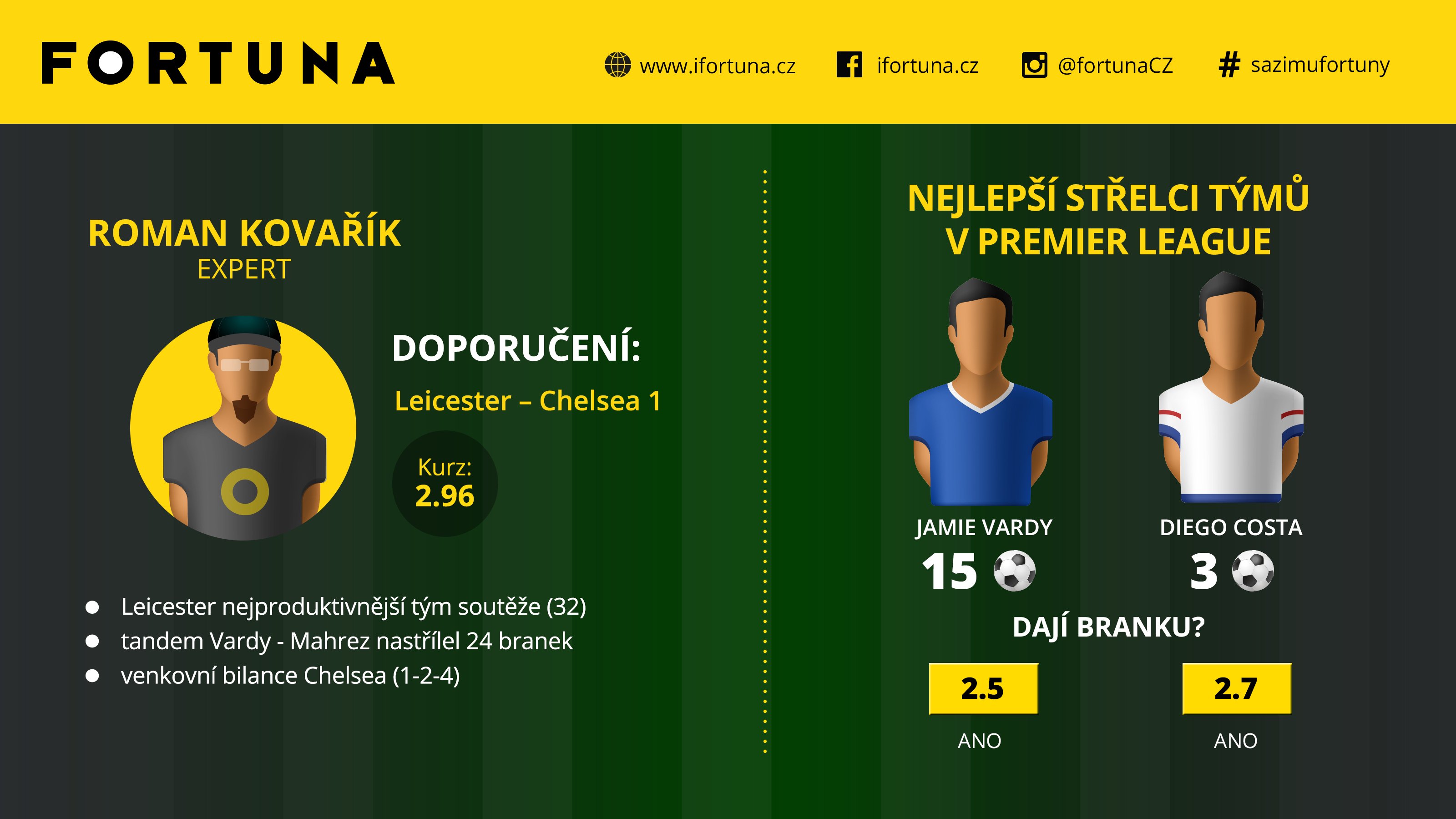 Obhájce titulu je v tíživé situaci, Chelsea se v tabulce nachází jen bod od sestupové příčky. Naopak Leicester se může znovu vrátit do čela Premier League, kde od neděle figuruje Arsenal. Tým manažera Mourinha v Lize mistrů jasně porazil Porto a ukázal své kvality. V posledních pěti soutěžních zápasech Chelsea vyhrála hned ve třech případech, černou kaňkou je však domácí krach s nováčkem z Bournemouthu. Lišky z Leicesteru jdou v posledních zápasech od jedné výhry ke druhé (13 bodů z posledních 5 zápasů). Když se netrefí Jamie Vardy, dokáže jej zastoupit další střelec – Mahrez, který v minulém zápase zaznamenal hattrick. Sestavy obou týmů se obešly bez překvapení. https://twitter.com/LCFC/status/676477233427562496 https://twitter.com/ChelseaFC/status/676476774285516800 https://twitter.com/TSBible/status/676442287652605952Přečtěte si taky: Čech vyrovnal Jamesův rekord a Arsenal je v čele Premier League!