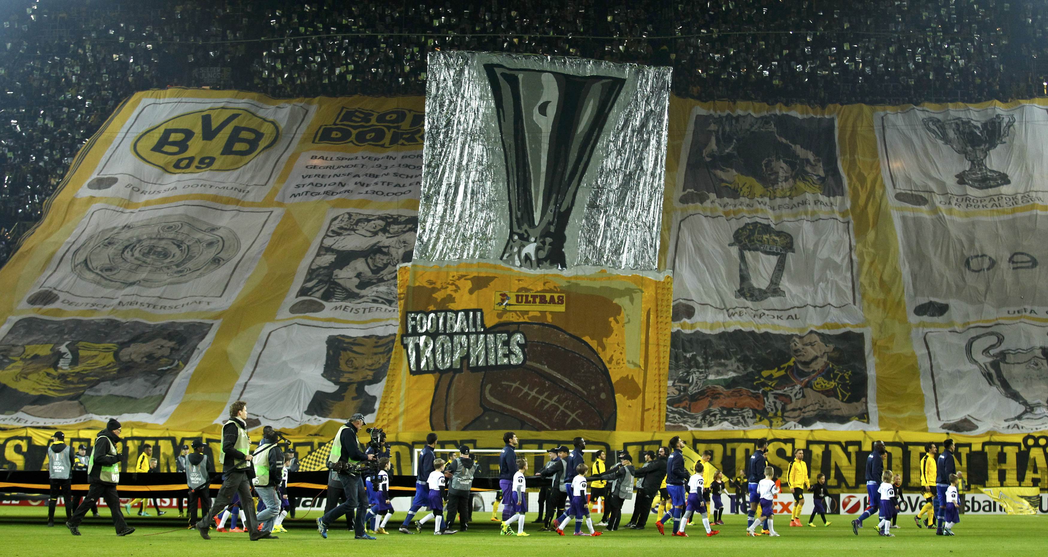 https://twitter.com/UberrFootbaII/status/700381788695355392 Borussia Dortmund je stálicí evropských pohárů a v roce 1997 dokonce vyhrála Ligu mistrů. Pohár z druhé evropské soutěže však ve sbírce trofejí zatím chybí, v letech 1993 a 2002 finálové zápasy Dortmund prohrál.Ve čtvrtek při příchodu fotbalistů na trávník odhalili fanoušci na jižní tribuně, známé také jako Yellow Wall, toto působivé choreo, které znázorňuje album s jedním políčkem volným – rezervovaným pro trofej z Evropské ligy. Zpráva je jasná: „Doplňte album, máte to ve svých rukách.“ https://twitter.com/BVB/status/700379570634170368