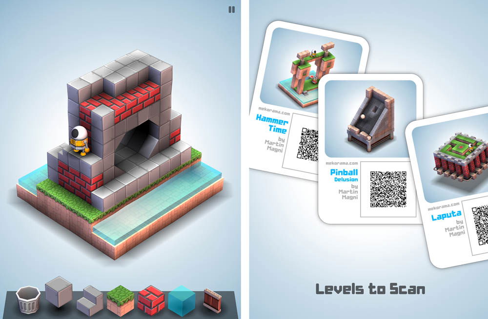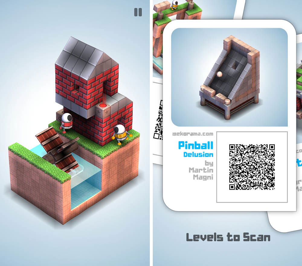 Mekorama je trochu jako klasická arkádovka, ale ve 3D a spíš zaměřená na logiku než na akci. Máte robůtka a musíte s ním projít do cíle úrovně. Cesta logicky není nejsnadnější a případně na vás čeká několik nástrah. A když všechny úrovně projdete, tak si další můžete sestavit sami a nebo je najdete na Facebooku autora. Mekorama je opravdu povedená aplikace. Nejen, že se dobře hraje a má nápad, ale hlavně si nové úrovně můžete sestavovat sami, nebo hrát ty, co vymysleli další hráči. V podstatě je to nekonečná zábava, navíc pro Android i iOS zdarma. Pokud vás ale hra bude bavit, můžete autorovi přispět na další vývoj. A to je rozhodně fér nabídka. Princip hry je v podstatě snadný. Jako v arkádovce prostě musíte projít s robůtkem od startu až do cíle. Rozdíl je v tom, že každá úroveň je ve 3D, což logicky dělá průchod složitějším. Minimálně na orientaci. Úhel natočení každé úrovně si můžete nastavovat dle libosti. S robůtkem se nesmíte chytit do nějaké pasti. Tahy jsou snadné. Kliknutím pošlete robůtka na požadované místo, pokud tedy lze projít, o což tady jde. Pokud to nejde, ukáže se vám malý křížek. Pak jsou zde různé pojízdné či spíš posuvné bloky. Tahem je dostanete tam, kam potřebujete. Někdy ale slouží jen jako pohon. Ostatně, vyzkoušejte sami, je to fakt povedené. Pokud by se vám nedařilo na řešení přijít, tak si můžete vyžádat nápovědu. Ovšem tedy jen v případě, že autorovi přispějete. V základní hře je 50 úrovní a odkrývají se vám postupně, jak je dokážete procházet. Příjemné je, že se otevře vždy o pár úrovní navíc, ne jen ta příští. Mekorama má pěknou grafiku, ovládání pohodlné a intuitivní. Snad jen úhly náhledu na úroveň, kterou si můžete a vlastně musíte natáčet podle potřeby, by mohly být rozmanitější. V podstatě je zde několik nastavených pohledů, mezi kterými rotujete. Co hru dělá výjimečnou, je nekonečné množství nových úrovní. Buď si je sestavíte sami v editoru a není to nic složitého nebo komplikovaně řešeného. A nebo si můžete zahrát úrovně, které již někdo jiný sestrojil. Autor je přidává na svou facebookovou stránku a nebo na twitterový účet. Nahrání je snadné, stačí načíst QR kód, který se automaticky vygeneruje pro každou novou úroveň. I to je velmi zajímavé a funkční řešení. Mekorama nezabere příliš místa a výhodou je, že ji lze hrát i off-line, tedy bez připojení k internetu. Což už dnes rozhodně není žádná samozřejmost.