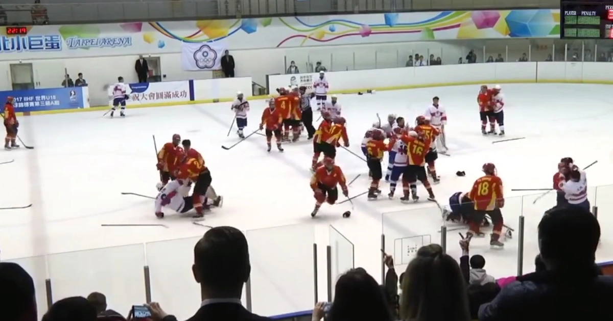 Že hokej dokáže pořádně rozvášnit i Asiaty ukázali hráči Číny a čínské Tchaj-peje. Obě země se zrovna nemusí ani na politickém kolbišti, přesto asi málokdo očekával takovou řežbu. V utkání mistrovství světa hráčů do 18 let divize 3 na ledě Tcha-peje vyhrála Čína jasně 4:0, takže to na extrémně zjitřené emoce nevypadalo. Jenže při tradičním podání rukou po konci utkání jeden z čínských hokejistů srazil soupeře a vypuklo peklo. Domácí fanoušci zasypali led nejrůznějšími předměty, hokejisté si to rozdali na pěsti.