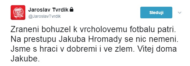 Předseda představenstva Slavie Jaroslav Tvrdík v neděli dopoledne vnesl do případu jasno. „Zranění bohužel k vrcholovému fotbalu patří. Na přestupu Jakuba Hromady se nic nemění. Jsme s hráči v dobrém i ve zlém. Vítej doma, Jakube,“ napsal Tvrdík na Twitter a fanoušci nešetřili pozitivnímu reakcemi. „Jsem rád, že se takhle Slavia zachovala, ne každý tým by si zraněného hráče nechal nebo koupil, viz např. Manchester United,“ napsal jeden z fanoušků, který zřejmě narážel na případ zraněnéhoZlatana Ibrahimoviče, jemuž manchesterský klub neprodloužil smlouvu.