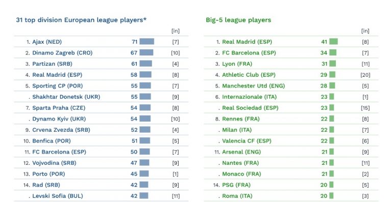 Mládežnický úsek pražské Sparty vedený Jaroslavem Hřebíkem se dočkal skvělého ocenění. Podle webu CIES Football Observatory totiž Letenští vychovali hned 54 hráčů (8 jich je i v současném kádru), kteří momentálně působí v 31 evropských ligách. To Spartu řadí na 7. místo v Evropě! Nejvíce do evropského fotbalu přispívá nizozemský Ajax, jehož slavná Ajax Youth akademie vychovala 71 hráčů. Druhé a třetí místo patří balkánským baštám talentů, Dinamu Záhřeb (67) a Partizanu Bělehrad (61). Až čtvrtý je 58 hráči Real Madrid – jediný skutečný evropský gigant v první desítce. Sparta tak například přeskočila 11. Barcelonu, 16. Arsenal nebo 25. Manchester United! Do první padesátky se z českých klubů dostala ještě Slavia (32. místo) a Sigma Olomouc (34. místo). Žádný z českých klubů se už ale nevešel do žebříčku, v němž se započítává výchova hráčů momentálně hrajících v top 5evropských soutěžích. Tam už kraluje Real (41 hráčů) před Barcelonou a francouzským Lyonem. Football Observatory počítal odchovance podle definice UEFA, tedy hráče, kteří strávili mezi 15. a 21. rokem v klubu alespoň tři kompletní sezony. Sledujte v neděli šlágr HET ligy Sparta Praha - Baník Ostrava na O2 TV Sport a O2 TV Fotbal od 17.30! [blog_program_info id="18368554"]