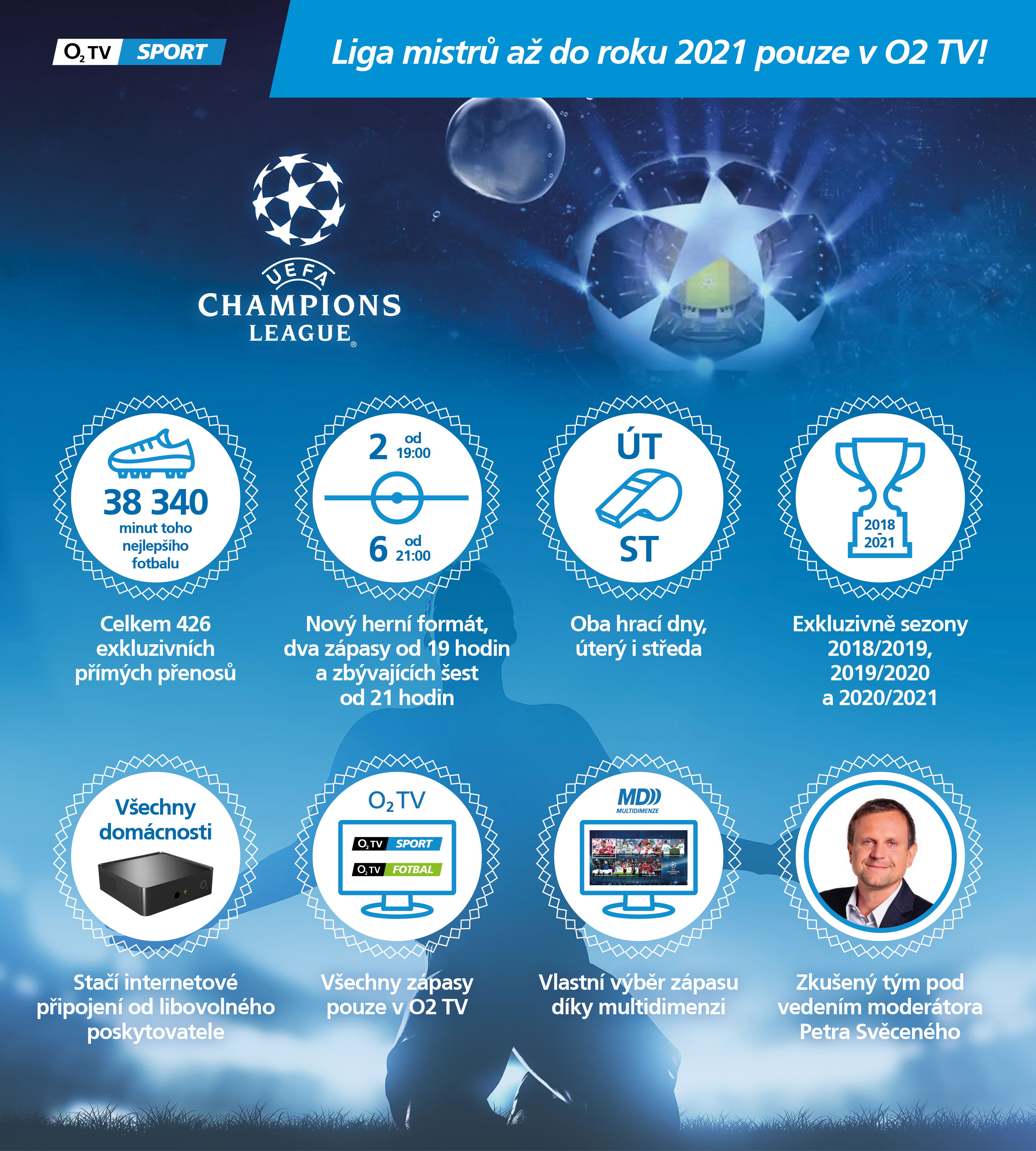 Je to tady - pro fanoušky fotbalu a naší O2 TV máme skvělou zprávu. Nejslavnější a nejprestižnější fotbalovou soutěž světa – Ligu mistrů UEFA - uvidíte totiž v sezonách 2018/2019, 2019/2020 i 2020/2021 exkluzivně jen v O2 TV. Sportovní nadšenci se navíc mohou s největší pravděpodobností těšit na účast českého týmu přímo v základní skupině. Od srpna 2018 tak zápasy z prestižní UEFA Ligy mistrů budete moc sledovat pouze na stanicích O2 TV Sport a O2 TV Fotbal. A bude to jízda. Výhradní práva se totiž vztahují na zápasy ve 4. předkole, v základních skupinách i ve vyřazovací fázi Ligy mistrů, včetně samotného finále a Superpoháru UEFA. V každé sezoně se tak na O2 TV dočkáte více než 140 přímých přenosů v osmnácti hracích týdnech. Ředitel O2 TV Marek Kindernay k tomu podotýká, že i nadále si zákazníci mohou užívat multidimenzi i atraktivní rozhovory, komentáře a magazíny. V příští sezóně se navíc můžete těšit i na nové časy zápasů, kdy se budou hrát hned dva duely už od 19:00 hodin a zbývajících šest pak od 21:00 hodin. Jak už jsme uvedli, předpokládá se, že ve zmiňované sezoně 2017/2018 postoupí do základní skupiny Ligy mistrů mistr české HET ligy. Druhý tým nejvyšší české fotbalové ligy se pak představí v předkole této „milionářské soutěže“. Co k fandění u televize potřebujete? Ligu mistrů UEFA mohou všichni fanoušci sledovat nejen ve svých domácnostech, kde stačí mít internetové připojení od libovolného poskytovatele, ale také ve více než 1200 restauracích po celé České republice. U našich zákazníků je navíc stále populárnější předplatit si kanál O2 TV Sport na 24 hodin, kdy můžete přenosy svých favoritů sledovat v prohlížeči nebo v aplikaci O2 TV na vašem mobilu či tabletu. Veškeré informace o O2 TV najdete zde S O2 TV dostane sledování vašich oblíbených klubů úplně jiný rozměr. Užijte si unikátní funkce, které využívají statisíce diváků. Patří mezi ně výběr ze souběžně hraných zápasů či pohled z několika úhlů kamer. Nabídku O2 TV navíc můžete sledovat až sedm dní zpětně. Zápasy a pořady si navíc můžete vybírat v novém přehledném Moje menu, které vám v každém okamžiku analyzuje tisíce hodin obsahu na všech kanálech a přehledně je třídí do osmi nejpopulárnějších obsahových kategorií. Nezapomeňte ale, že už od 13. února se můžete těšit na jarní část aktuálního ročníku Ligy mistrů.