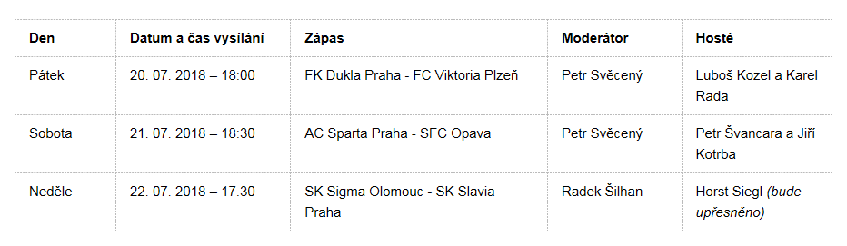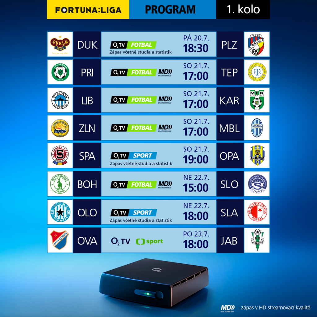 O2 TV, která pro nadcházející roky nakoupila nejvíce exkluzivních sportovních přenosů v České republice, zahajuje v pátek revoluční vysílání první fotbalové ligy. Díky novým technologiím, které O2 TV přináší do českého fotbalu, budou moci zákazníci poprvé v historii sledovat v televizi všechny zápasy první ligy. O2 TV nabídne unikátní multidimenzi, která umožní výběr ze souběžně hraných zápasů, zpětné zhlédnutí až 7 dní, přepínání mezi kamerami i systém Tracab, díky kterému je možné porovnávat v reálném čase aktuální statistiky. To vše až na čtyřech zařízeních – televizi, počítači, telefonu nebo tabletu. Zábavná fotbalová show TIKI-TAKA pokračuje pravidelně v pondělí od 20.00 hodin. Televize O2 TV nasadí v prvním kole na nejatraktivnější zápasy moderní přenosový vůz, který umožní zapojení videorozhodčího. Půjde o duely: Dukla – Plzeň, Sparta – Opava a Olomouc – Slavia. Jen diváci O2 TV uvidí v dalších letech kromě kompletní FORTUNA:LIGY také všechny zápasy hokejové extraligy a kompletní Ligu mistrů UEFA. Digitální televize O2 TV nabízí nyní svým zákazníkům rekordní množství sportovního obsahu. Kromě kompletní Ligy mistrů, kde nechybí ani 4. předkolo, vyřazovací fáze, samotné finále a Superpohár UEFA, se pouze divák O2 TV může těšit na stovky přenosů z české nejvyšší fotbalové soutěže. Jak bude vysílací formát FORTUNA:LIGA vypadat? Stanice O2 TV Sport přinese exkluzivně tři nejlepší zápasy z každého kola v nejvyšší kvalitě. U těchto duelů nebudou chybět zápasová studia, výběr z více pohledů kamer nebo systém Tracab, který živě sleduje statistiky o týmech či hráčích. Divák tak má jistotu, že nejatraktivnější utkání jako jsou derby pražských "S", duely z finálové nadstavby či střetnutí Plzně proti Slavii a Spartě uvidí výhradně na O2 TV Sport. [caption id="attachment_12254" align="alignnone" width="1024"] Tisková konference O2 TV Sport v pražském hotelu Hilton, 18. 6. 2018[/caption] Další čtyři utkání poběží v O2 TV v multidimenzi v tzv. HD streaming kvalitě. „Tato utkání budou v HD rozlišení, ale jsou přenášená menším počtem kamer,“ vysvětluje Marek Kindernay, výkonný ředitel stanice O2 TV Sport. „Je to historický moment, kdy umožníme fanouškům všech klubů v první lize, aby živě sledovali výkony svých oblíbenců. Samozřejmě se to týká i nadstavbové části, kde se odehrají skupiny o titul, o postup do Evropské ligy a o udržení,“ doplnil Marek Kindernay. Jeden zápas (čtvrtá volba) z každého kola FORTUNA:LIGY pak odvysílá kanál ČT sport, který zákazníci O2 TV najdou ve všech tarifech. Tradičně v pondělí od 20.00 hodin pokračuje na O2 TV Sport zábavná show TIKI-TAKA, kde moderátor Petr Svěcený každý týden společně se svými hosty glosuje aktuální dění z fotbalových trávníků. Fanoušci se opět dočkají řady zajímavých hostů z fotbalového i kulturního života. Před startem nové sezony se dočkala posily i fotbalová redakce O2 TV, kterou doplní moderátor a komentátor Michal Hrdlička. Ten má za sebou působení na TV Nova nebo DIGI TV. V O2 TV se bude věnovat především české fotbalové lize a Lize mistrů. Od září se navíc diváci O2 TV Sport dočkají i jeho sportovní talkshow Česká ulička Michala Hrdličky. https://www.youtube.com/watch?v=u-SVAa12pLQ Zápasová studia v 1. kole FORTUNA:LIGY na O2 TV Sport a O2 TV FotbalSportovní přenosy v O2 TV mohou sledovat všichni zákazníci nejen ve svých domácnostech, kde stačí mít internetové připojení od libovolného poskytovatele, ale také ve více než 1 200 restauracích po celé České republice. Další stále populárnější možností je O2 TV Sport s přístupem Na den, kde přenosy běží v prohlížeči nebo v aplikaci O2 TV na mobilu i tabletu. Obsah O2 TV Sport Na den je nyní navíc dostupný i v HbbTV aplikaci TV Prima. https://www.youtube.com/watch?v=ZV3ZwuTNrmI