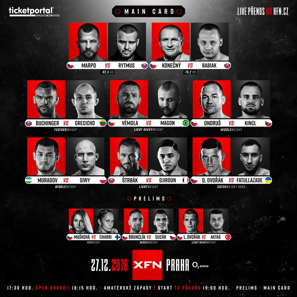 Už ve čtvrtek rovněž poznáme jméno MMA zápasníka, který si řekne o možnost odvety s Karlosem „Terminátorem“ Vémolou. Bude to lepší z dvojice Petr „Píno“ Ondruš vs. Patrik Kincl. Jejich bitva bude jednoznačně tím nejlepším, co blížící se XFN 15 nabídne. Tihle dva se v poslední době opravdu moc nemusí. „Kdyby se Patrikovi náhodou podařilo dostat přes Pína, tak dostane příští rok namláceno,“ prohlásil Vémola. „On se k tobě ale vůbec nedostane,“ doplnil ho Ondruš. Jeho vyzyvatel je připraven zareagovat až v kleci. V O2 areně se fanouškům předvede i již zmiňovaný český „Terminátor“, kterému se postaví Brazilec RodrigoMagon. „Fanouškům nadělím pořádnou Vémolici,“ slibuje. O pozornost si říká i start slovenské hvězdy a šampiona organizace M-1 Global Ivana Buchingera. Ten vyzve v titulovém zápase Litevce SergejeGrechicha o pás pro šampiona XFN v pérové váze. Přímý přenos galavečera XFN 15: Marpo vs. Rytmus začíná na O2 TV Sport tento čtvrtek od 18:50 hodin. Součástí vysílání bude i studio moderátora Davida Sobiška, role experta se ujme šéftrenér pražského Penta Gymu Daniel Barták. Přenosem bude diváky provázet komentátor Michal Petrgál a také český MMA bojovník Viktor Pešta, který prošel nejprestižnější organizací světa UFC.