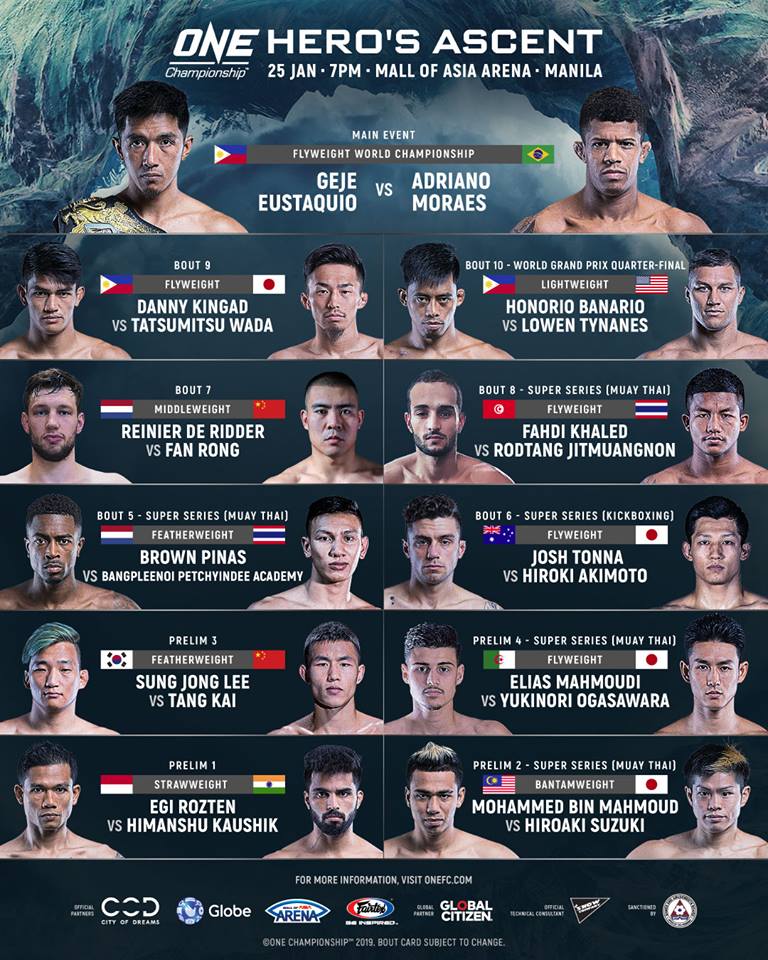 Nyní se ONEChampionship představí v Manile, hlavním městě Filipín. A rovněž galavečer s podtitulem Hero’s Ascent okoření titulovýzápas. Domácí hvězda GejeEustaquio (bilance 11 výher – 6 porážek) bude obhajovat pás šampiona v muší váze proti dalšímu špičkovému MMA zápasníkovi AdrianuMoraesovi z Brazílie (17-3). Tihle dva se proti sobě v kleci postaví už potřetí. Poprvé se utkali v prosinci 2014 v Kambodži, kde slavil „Mikinho“ Moraes. Loni v červnu ale v Macau uspěl Filipínec známý jako „Gravity“ na body a svému protivníkovi uštědřil teprve třetí porážku v profi kariéře. Od té doby se zároveň pyšní mistrovským pásem. „Jen málokdo věřil, že před vámi budu stát jako šampion. Během kariéry jsem se přesvědčil, že slovo nemožné neexistuje,“ pronesl na tiskové konferenci Eustaquio. „Adriano, kterého jste viděli v předchozím zápase s Gejem, to jsem nebyl já,“ zdůraznil Moraes. „Tentokrát jsem velmi dobře připraven. Bude to dobrý fight, těším se na něj,“ dodal Brazilec, který se netají touhou získat titul zpátky.