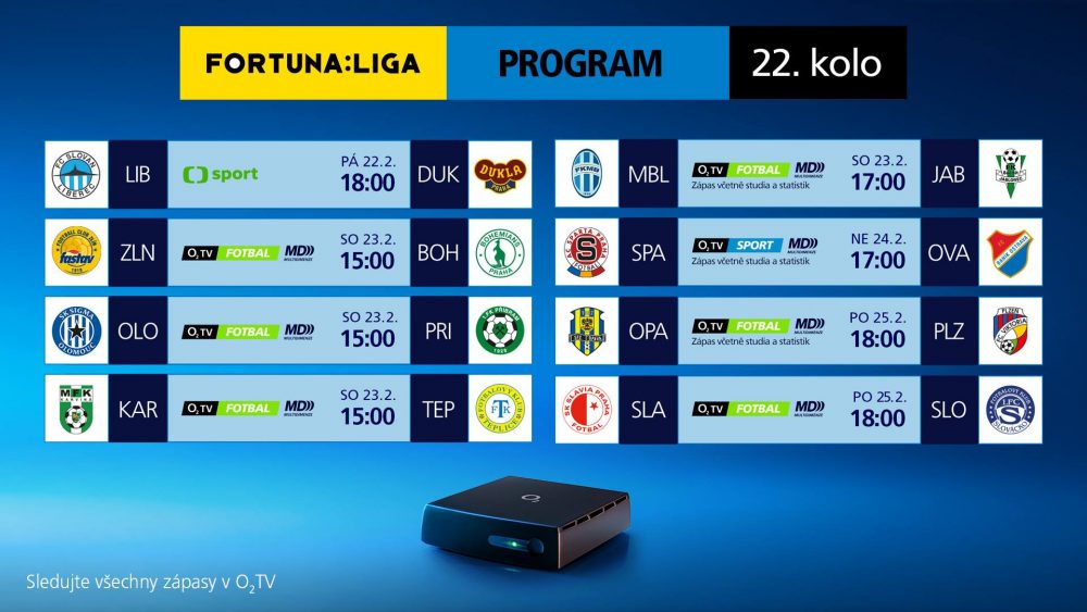 Všechny zápasy 22. kola můžete sledovat živě jen v O2 TV. Duely Boleslav – Jablonec, Sparta – Baník a Slavia - Slovácko vám na stanicích O2 TV Sport a O2 TV Fotbal nabídneme v nejlepší vysílací kvalitě v multidimenzi. Chybět nebudou ani zápasová studia se zajímavými hosty a doprovodnými statistikami.
