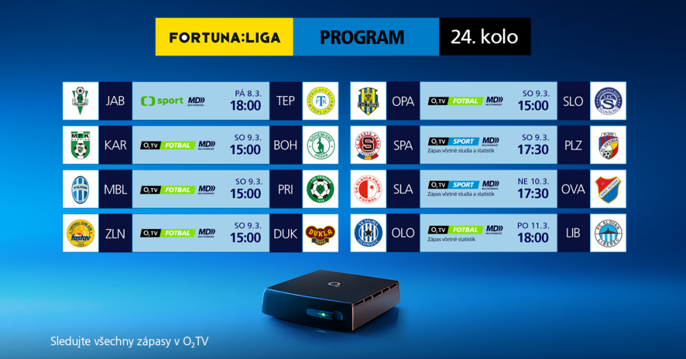 Všechny zápasy 24. kola FORTUNA:LIGY můžete sledovat živě jen v O2 TV. Duely Sparta - Plzeň, Slavia - Baník a Olomouc - Liberec vám na stanicích O2 TV Sport a O2 TV Fotbal nabídneme v nejlepší vysílací kvalitě v multidimenzi! Chybět nebudou zápasová studia se zajímavými hosty a doprovodnými statistikami.