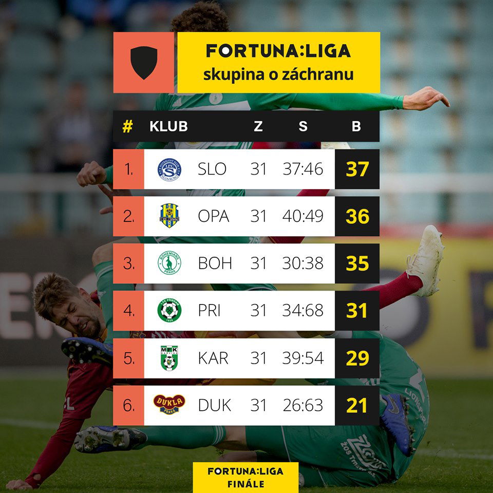 Ještě dýcháme, mohou si říkat na Dukle. Nejhorší tým skupiny po remíze s Bohemians sice udržel naději na účast v baráži, zároveň se k ní ale ani nepřiblížil. Čtyři kola před koncem nadstavby ztrácí na předposlední Karvinou, která padla v Opavě gólem z penalty v nastaveném čase, osm bodů. Hráči z Julisky jsou dál aspirantem na přímý sestup do druhé ligy číslo jedna. Výrazný krok směrem k poklidnému závěru sezony udělalo Slovácko. Celek z Uherského Hradiště nasázel na domácím stadionu pět gólů Příbrami a na čele minitabulky má šestibodový odstup od barážových příček. O účast v nejvyšší soutěži by se nyní šla prát Příbram s Karvinou.- Výsledky: