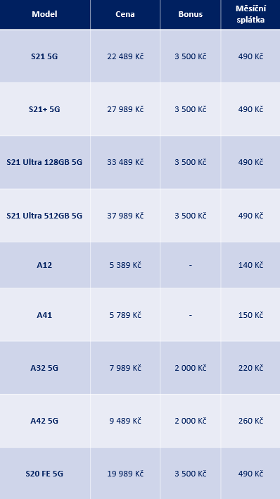 Toužíte po novém Samsungu? Zkuste třeba S20 FE 5G. Při jeho pořízení dostanete zpátky 3 500 korun. S bonusem můžete mít v únoru u O2 exkluzivně i modely A32 a A42. Telefony vám navíc dodáme pohodlně domů s dopravou zdarma. Zmiňovaný Samsung Galaxy S20 FE 5G má 6,5palcový Full HD+ displej a hned 3 zadní fotoaparáty (12 Mpx hlavní +12 Mpx širokoúhlý + 8 Mpx teleobjektiv; 3× optický zoom). Nechybí ani přední selfie kamera s 32 Mpx. Při jeho pořízení dostanete zpět 3 500 korun. Koupit si jej ale můžete i na splátky. Měsíčně vás tak vyjde na 490 korun. S bonusem je k mání i nejnovější Samsung Galaxy S21 5G disponuje 6,2palcovým LTPS displejem s rozlišením FHD+ a plynulou obnovovací frekvencí 120 Hz. Více informací o všech modelech najdete na tomto webu.