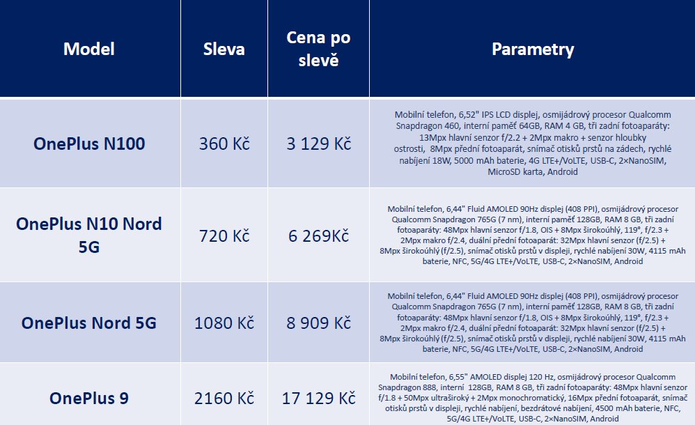 O2 pokračuje ve Slevománii. 5G kousky získají zájemci do 23. května se slevou až 2 160 korun. K telefonům Xiaomi navíc dostanou exkluzivně bezdrátová sluchátka nebo chytrý náramek za 1 korunu. Se slevou 1080 korun si mohou pořídit OnePlus Nord 5G. Telefon disponuje displejem s 90Hz obnovovací frekvencí. Samozřejmostí je rychlé nabíjení. Nabíječka a kabel USB-C/A jsou součástí balení. Zaujmou hned 4 zadní fotoaparáty a výkonná stereo reprodukce. Se slevou je k mání za 8 909 korun. Výhody 5G zájemci objeví i díky modelu OnePlus N10 Nord 5G. Se slevou je připravený za 6 269 korun.