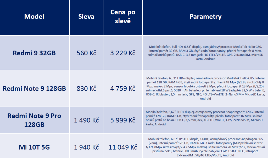 K vybraným smartphonům Xiaomi navíc zájemci dostanou exkluzivně chytrý náramek Xiaomi Mi Band 5 nebo bezdrátová sluchátka Mi True Wireless Earbuds Basic 2 pouze za 1 korunu. Zkusit mohou třeba model Redmi Note 9 Pro 128 GB, který se slevou získají za 5 999 korun. Telefon disponuje velkým displejem, velmi výkonným hardwarem i silnou baterií. Více informací je k dispozici na webové stránce o2.cz/slevomanie, kde je možné si telefony i zakoupit.