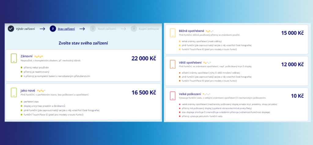 2. Podle nastavených kategorií posoudíte stav starého zařízení. Záleží hlavně na tom, jestli jsou v pořádku všechny funkce a jestli je na zařízení nějaké estetické poškození (poškrábaný displej, oděrky, plně funkční nabíjení, fotoaparát, Face ID apod.). Pokud se například jedná o Samsung Galaxy Z Fold4 5G (256 GB), který je zánovní (s originálním obalem), můžete za něj dostat až 22 000 Kč zpět na váš účet. Zvolený stav telefonu je v dalších krocích kontrolován.