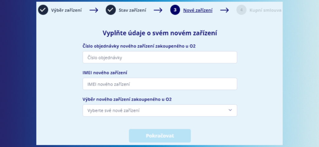 3. Vyplníte údaje o svém novém zařízení zakoupeném v O2 (číslo objednávky, IMEI, model). Dobrá zpráva – výkupní bonus můžete žádat i na telefon zakoupený na splátky. Následně jen doplníte osobní údaje včetně čísla bankovního účtu (pro zaslání výkupní ceny a bonusu) a souhlasy potřebné k uzavření kupní smlouvy.