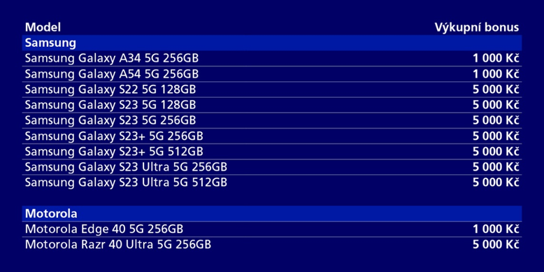 K hodnotě vykoupeného telefonu, která vám už dorazila od Mobil Pohotovosti na účet, se ještě můžete těšit na dodatečný bonus. Ten vám pošleme do 30 dnů od vytvoření registrace výkupu a odvíjí se od typu nově koupeného mobilu. Na bonus 5 000 Kč dosáhnete, když si po prodeji funkčního starého zařízení koupíte jeden z uvedených typů telefonů značky Samsung nebo Motorola níže v tabulce.
