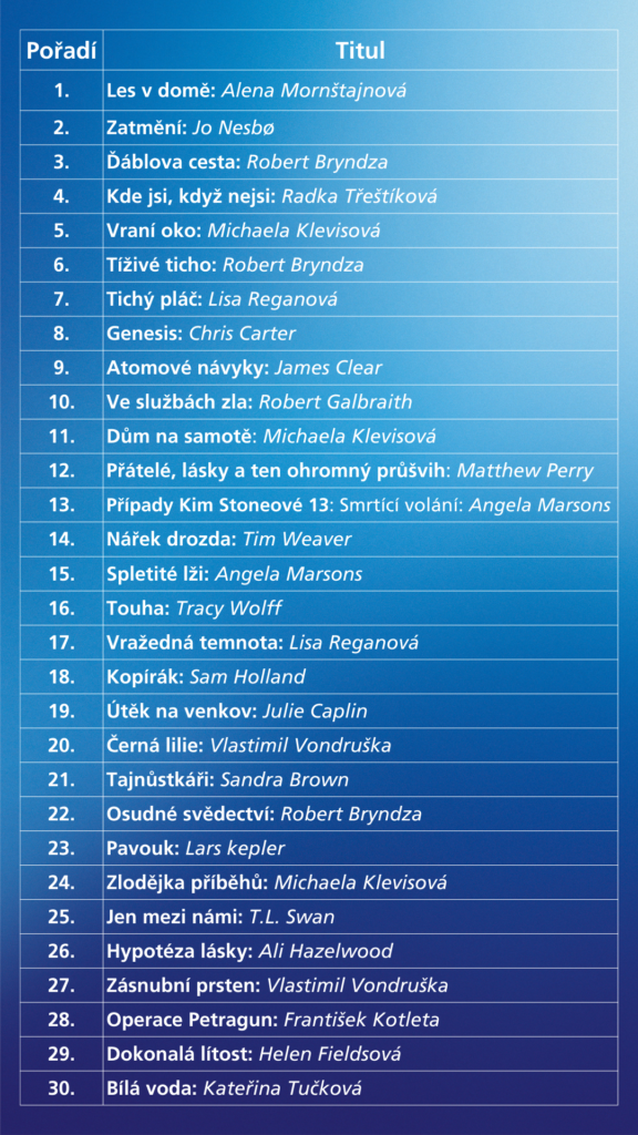 Do první třicítky nejčtenějších e-knih v O2 Knihovně se probojovaly primárně detektivní romány. Žebříčku dominují autoři a autorky Robert Bryndza, Michaela Klevisová, Lisa Reganová a v první pětce se objevil i román Radky Třeštíkové „Kde jsi, když nejsi“. Pokud jste ještě některou z nich „nezhltli“, berte žebříček jako inspiraci pro další čtení. Nejen všechny tyto e-knihy, ale i 44 000 dalších najdete stále v O2 Knihovně. Představíme si alespoň první tři vítěze…